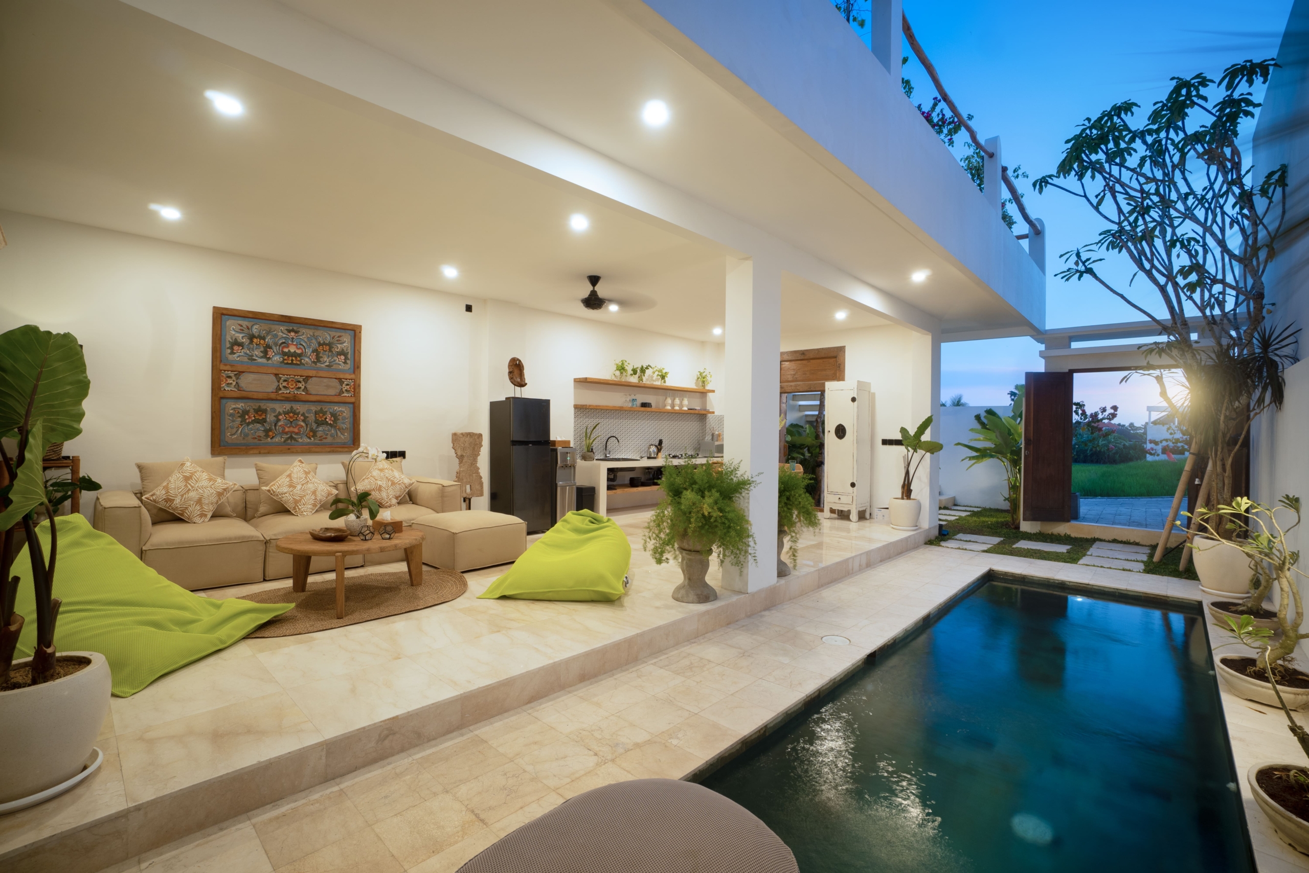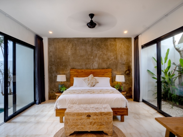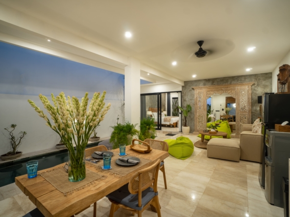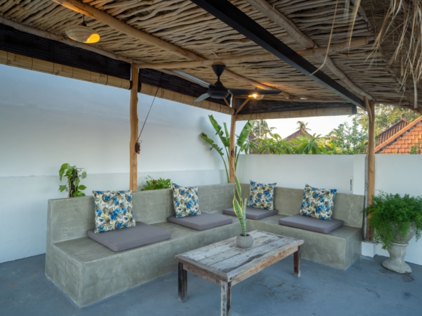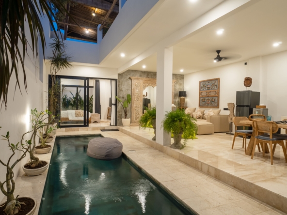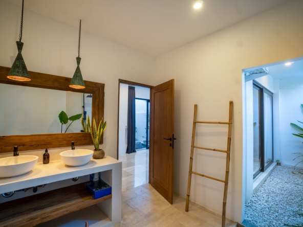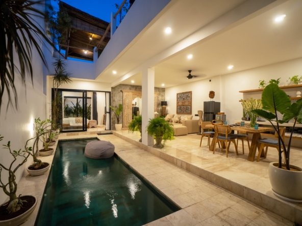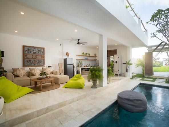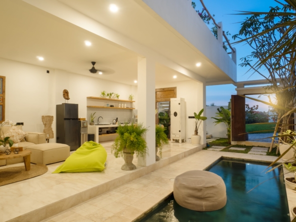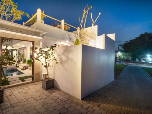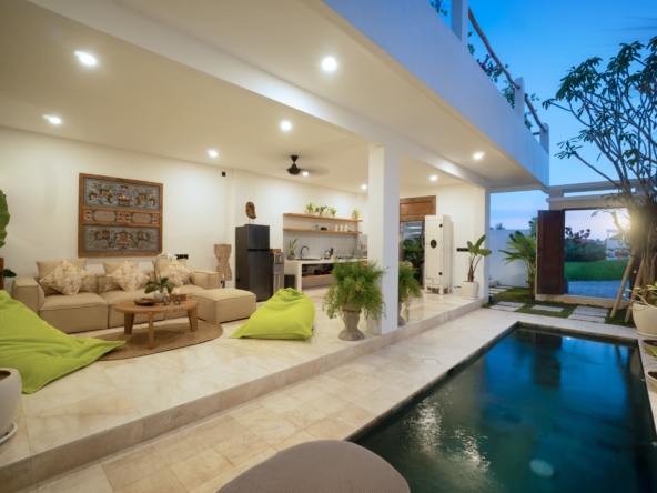 This light-filled, modern villa is tucked away in the peaceful residential area of Tumbak Bayuh, offering a serene retreat just 10 minutes from Pererenan Beach and Canggu. Ideal for those who value tranquility while staying close to Bali’s lively coastal scene. Set on 140 m² of land with an 86 m² building, the villa features a refreshing swimming pool, a spacious roof terrace, and generous car parking—delivering both comfort and convenience in a sought-after location.